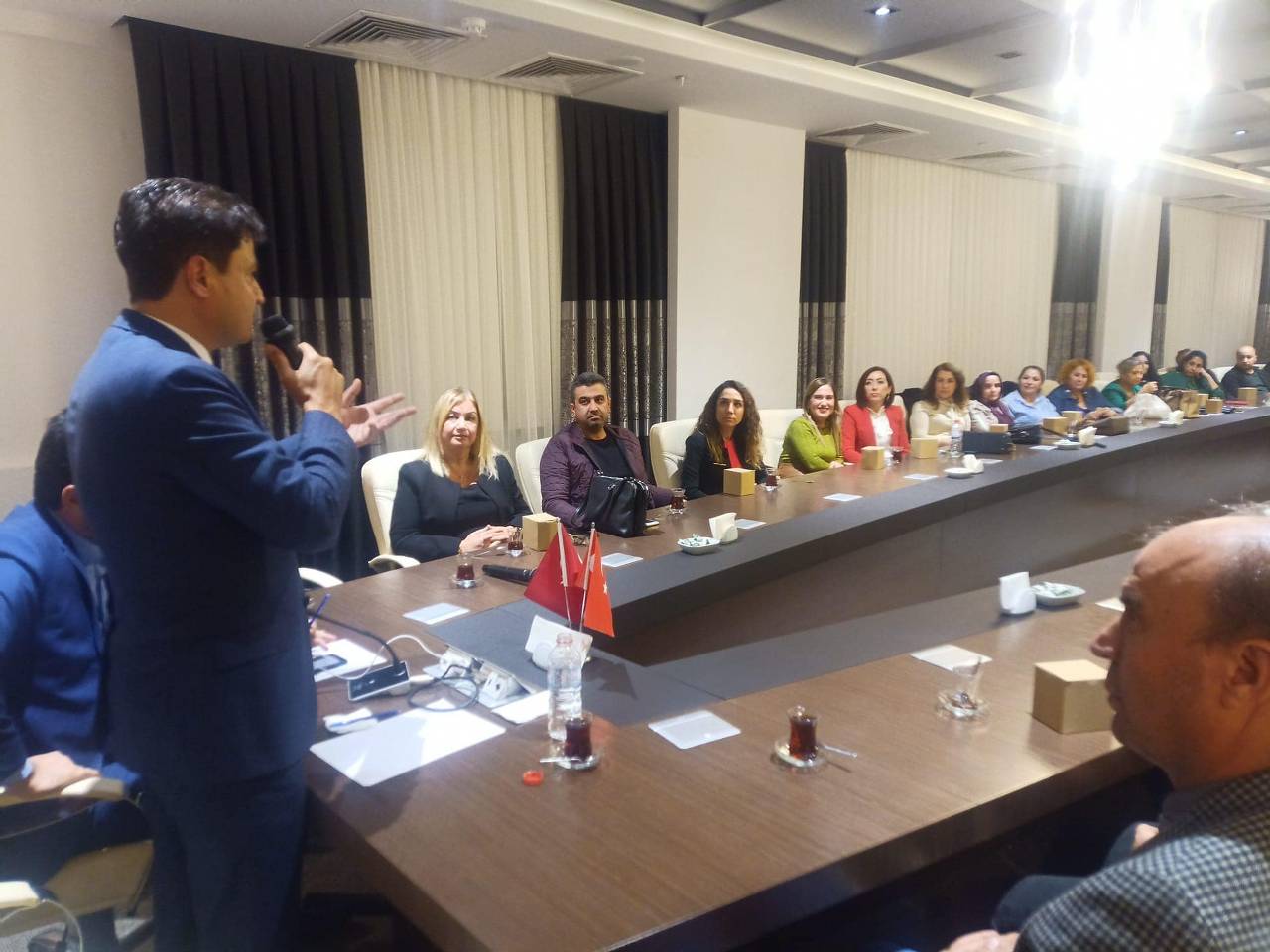 Adana 1 No’lu ve 4 No’lu Şubelerinin düzenlediği istişare toplantılarına da katılan Dolgun, burada şube yönetim kurulu üyeleri, ilçe ve işyeri temsilcileri ve üyelerimizle bir araya geldi. Toplantılarda yaptığı konuşmalarda girilmemiş son kalenin Türk Eğitim-Sen olduğuna dikkat çeken Dolgun, “Her koldan saldırdınız, farklı yerlerden destek aldınız ama olmadı, olmayacak. Kuşattık sandınız yine olmadı. Türk Eğitim-Sen’i şimdi bitirdik diye sevinç naraları atmaya başladınız yine olmadı. Hesaplayamadığınız, düşünemediğiniz; Türk Eğitim-Sen’in, genel başkanından şube başkanına, kadın komisyonlarından ilçe temsilcisine, işyeri temsilcisine, üyesine kadar cesur, yürekli, vatan sevdalısı, her zaman ve şartta eğitim çalışanlarının yanında saf tutup kazanım elde etmeleri noktasında mücadele eden, kökleri sağlam temellere oturmuş büyük ve güçlü bir teşkilat olduğudur” dedi.